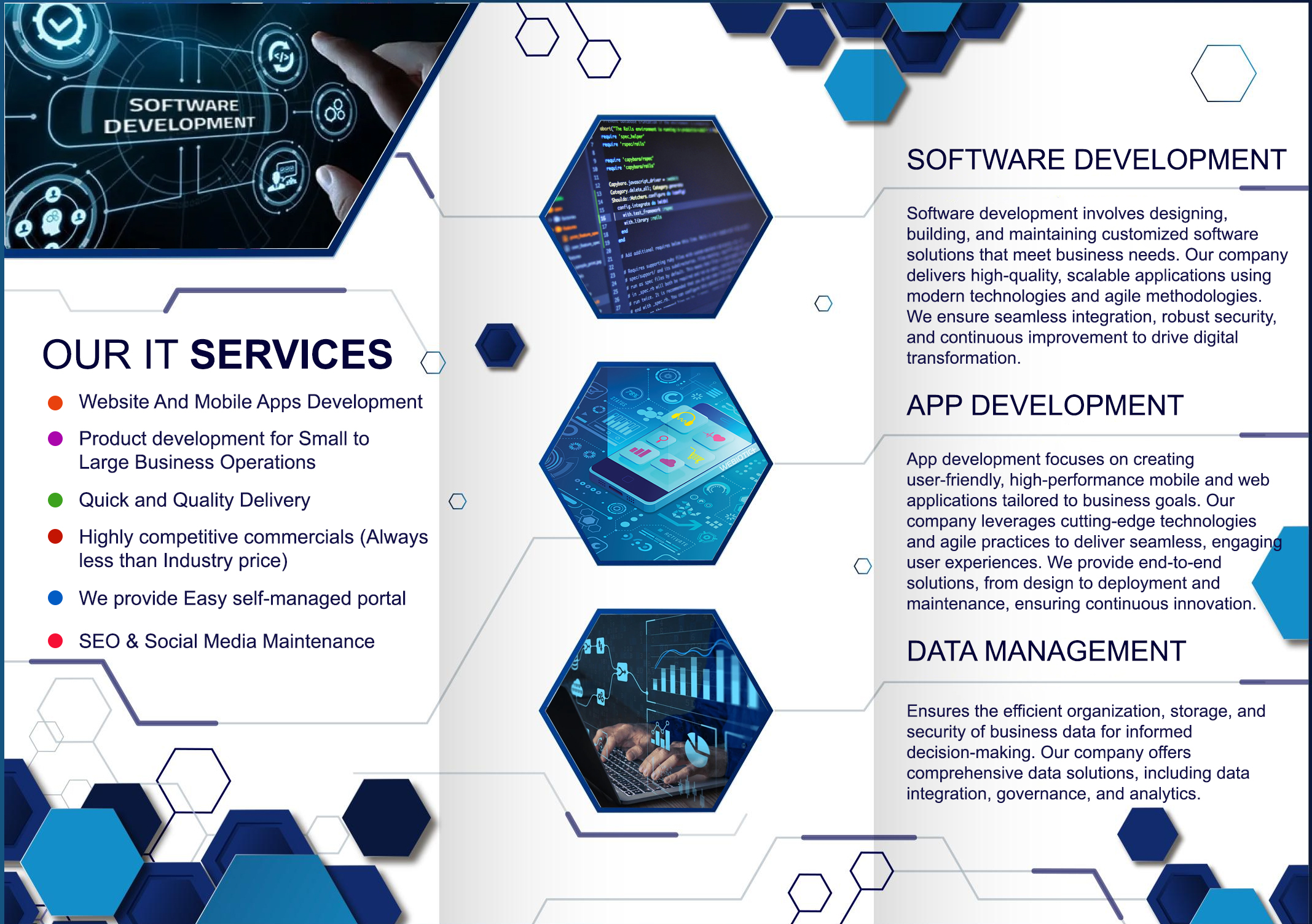 Our IT services empower businesses with end-to-end technology solutions, from software development and system integration to cloud services and cybersecurity. We deliver tailored strategies that drive digital transformation and operational efficiency. Partner with us for reliable support and cutting-edge IT innovations.
